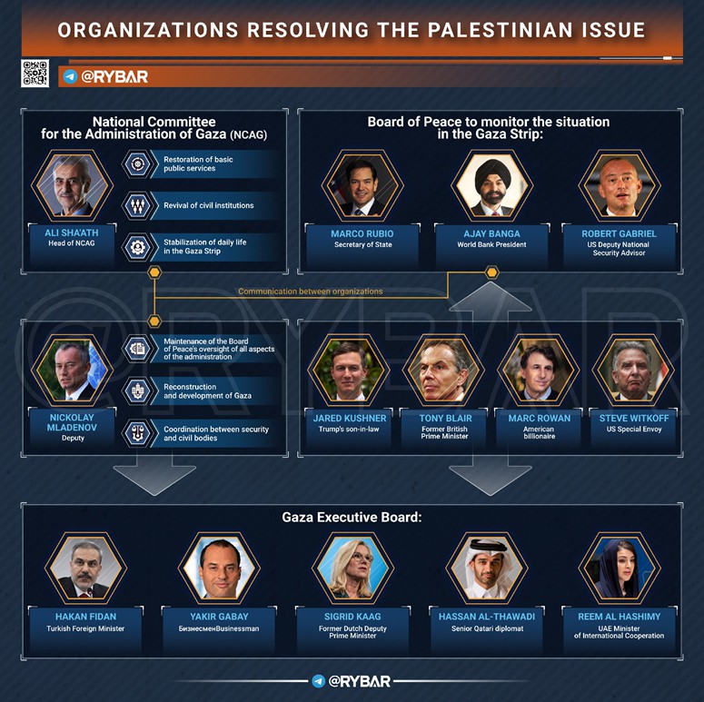 ➡️Bueno, dos organismos no fueron suficientes. Se creó un Consejo Ejecutivo para Gaza para apoyar la Oficina del Alto Representante y el NCAG, que incluye algunos miembros del "Consejo de Paz" y otros políticos y empresarios.