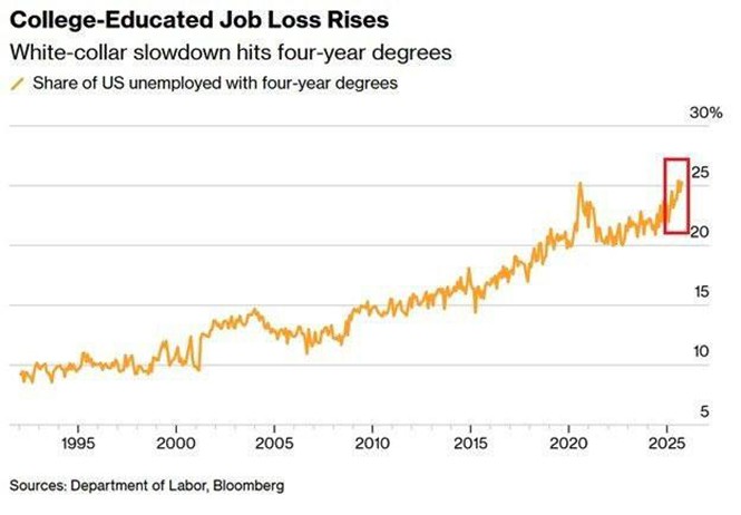 - Los estadounidenses con educación superior de cuatro años (licenciatura) actualmente representan un récord del 25,3% de los desempleados en EE. UU. Este porcentaje se ha duplicado desde 2008, lo que resulta en que más de 1,9 millones de titulados de 25 años o más estén actualmente desempleados. Este es el nivel más alto desde que comenzaron a recopilarse datos en 1992.