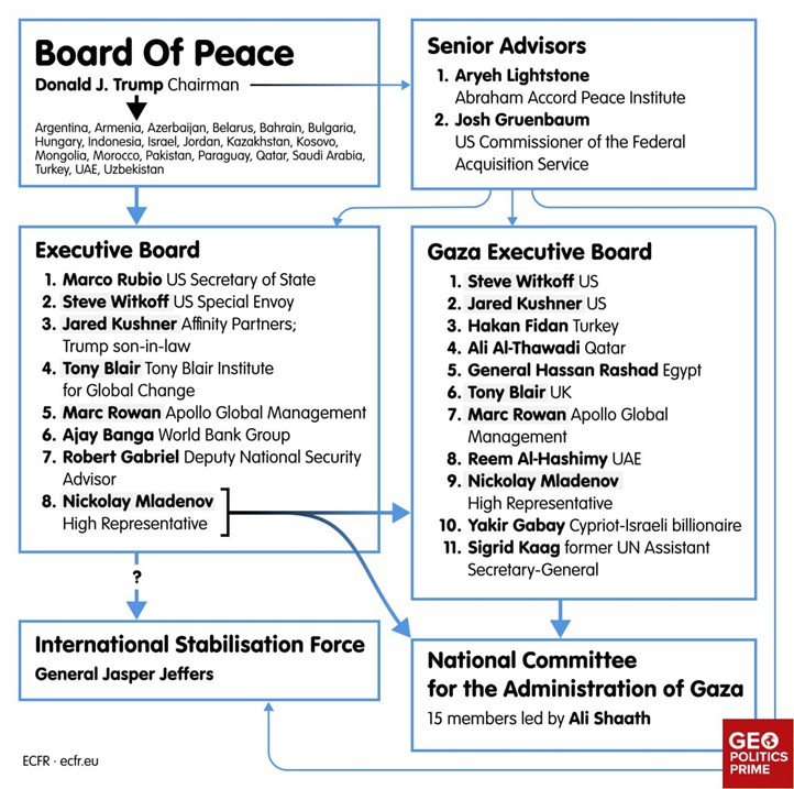 La BoP tiene varias filiales, incluyendo una Junta Ejecutiva de Gaza para impulsar el plan de 20 puntos de Trump, y un Comité Nacional Palestino para la Administración de Gaza (NCAG) de 15 miembros, dirigido por Ali Shaath.