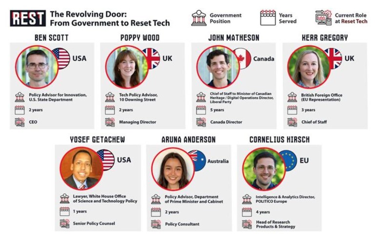Lo que hace a Reset Tech inusual es la densidad de exfuncionarios gubernamentales. El director ejecutivo, Ben Scott, fue asesor de políticas de innovación en el Departamento de Estado (2010-2012) durante la presidencia de Hillary Clinton. Posteriormente, coordinó la política tecnológica de la campaña presidencial de Clinton en 2016. Antes de Reset Tech, formó parte del consejo de administración de Stiftung Neue Verantwortung, un think tank alemán vinculado a círculos gubernamentales de políticas de seguridad.