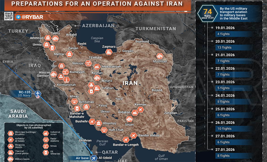 Un indicador clave del acumulamiento de fuerzas de EE. UU. es la actividad de la aviación de transporte militar, con el número de vuelos a bases de Oriente Medio desde el 19 de enero ya alcanzando 74 vuelos. Esto se refiere solo a aeronaves C-17 y C-5. Además, Boeing-747 comerciales también han estado en circulación.