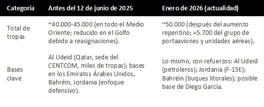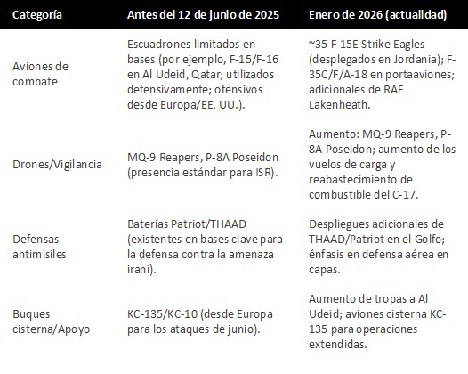 Tabla comparativa: Activos navales estadounidenses en el Golfo Pérsico antes del 12 de junio de 2025 en comparación con enero de 2026