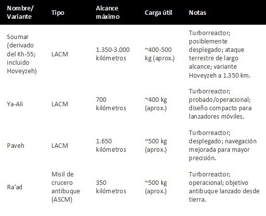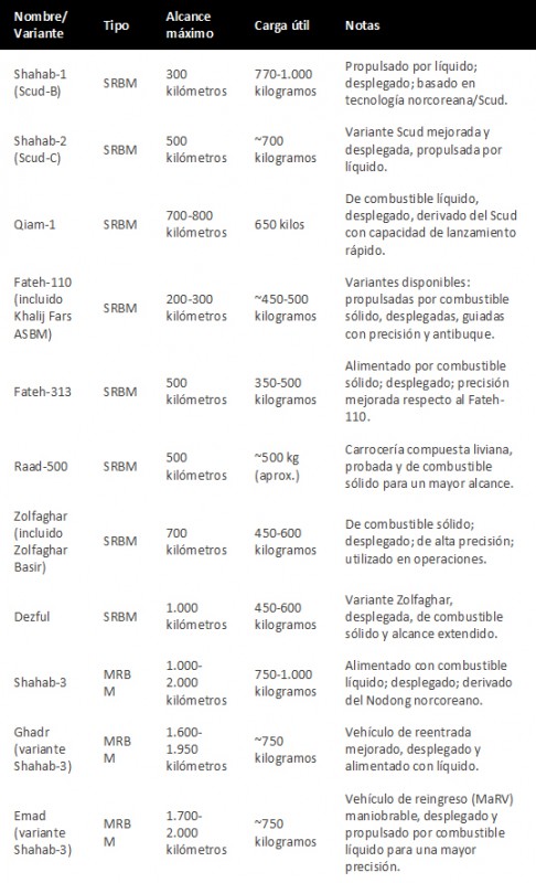 El arsenal iraní incluye misiles balísticos de corto alcance (SRBM, <1000 km), misiles balísticos de mediano alcance (MRBM, 1000-3000 km) y misiles de crucero de ataque terrestre (LACM), muchos de ellos con variantes antibuque. Además, Irán realizó recientemente una prueba exitosa de un misil balístico intercontinental (ICBM). Creo que las siguientes tablas les resultarán absolutamente impresionantes: