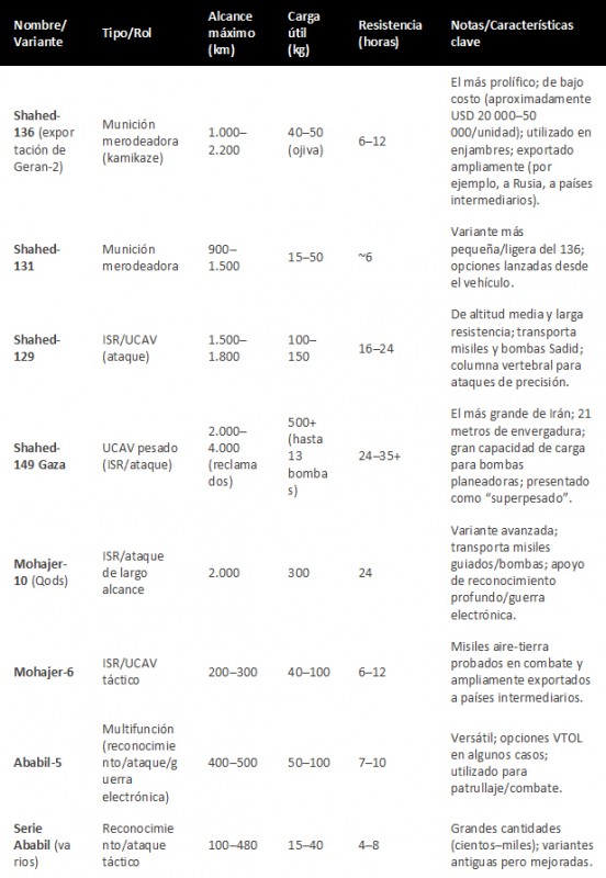Existen aproximadamente entre 15 y 20 tipos/variantes distintos de uso generalizado (excluyendo prototipos menores o versiones modificadas por proxy), con presentaciones continuas de nuevos modelos (por ejemplo, el dron suicida furtivo Hadid-110 a finales de 2025, los VTOL Homa/Dideban/Shahin-1 en 2025). La prioridad es la resistencia, el potencial de enjambre y la baja observabilidad para ataques de saturación.