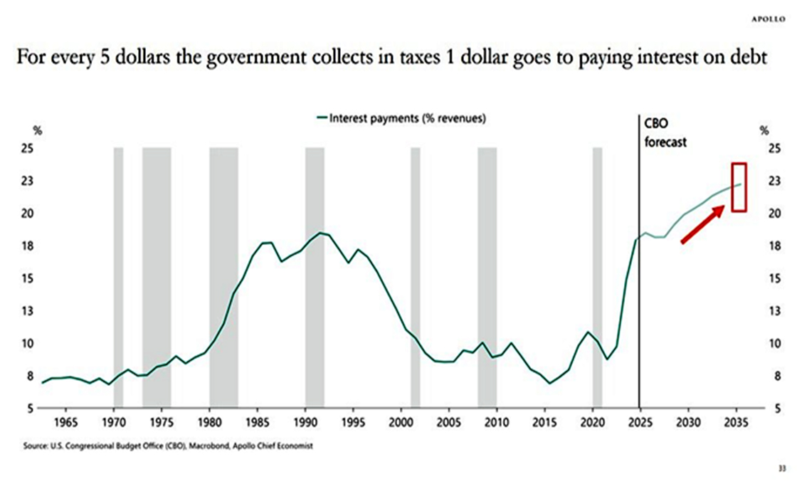 ▪️En los últimos 4 años, los pagos de deuda pública en relación con los ingresos aumentaron un 10% y alcanzaron un récord del 19%. Ahora, por cada 5 dólares que el gobierno recauda en impuestos, se paga 1 dólar en concepto de intereses de la deuda federal, — afirma la empresa de análisis The Kobeissi Letter (TKL)