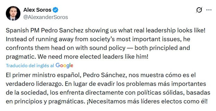 - Alexander Soros, hijo del magnate George Soros, sale en defensa de Pedro Sánchez y su iniciativa de regularizar a medio millón de migrantes ilegales: ¡Necesitamos más líderes electos como él!
