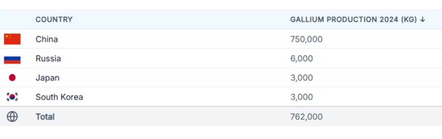 China produce el 99% de todo el galio mundial, mientras que Estados Unidos produce el 0%.