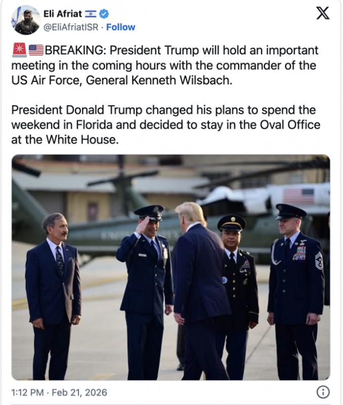 El despliegue masivo de medios aéreos de combate estadounidenses en Oriente Medio, acompañado de dos grupos de ataque de portaaviones, no es una estrategia de negociación. La cadena de mando del USCENTCOM, junto con los medios militares de apoyo (por ejemplo, AFSOC, JSOC, EUCOM), esperaban que se diera la orden de lanzamiento para un ataque el viernes por la noche. Pero la orden no se ha dado... Al menos no todavía, a las 22:00 horas, hora del este, del viernes. ¿Qué está pasando?
