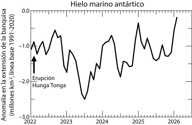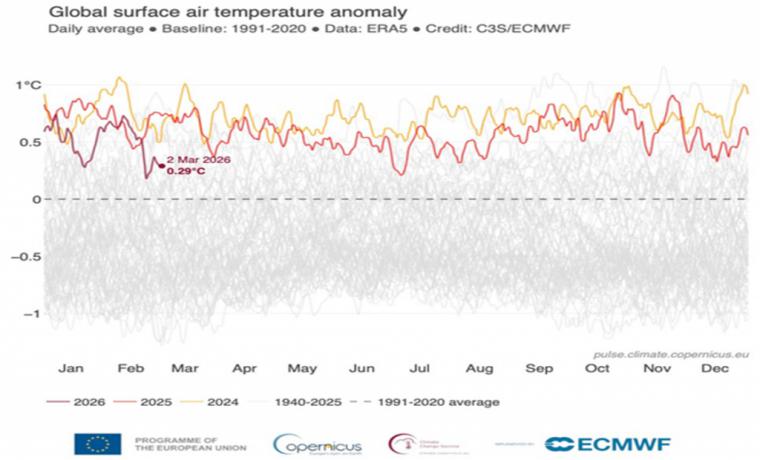 El enfriamiento del planeta desde 2024 alcanza ya el medio grado. Esto es una barbaridad y cuando ha sido al revés, y ha habido medio grado de calentamiento, ha ocupado todas las portadas. Un enfriamiento prolongado podría hacer peligrar las cosechas y tensionar un mercado energético bastante revuelto pero, afortunadamente, estamos en año de El Niño por lo que no se espera que el enfriamiento alcance niveles peligrosos.