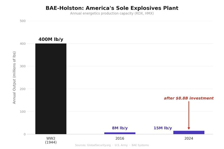 Durante la Segunda Guerra Mundial, esta empresa funcionaba a un nivel completamente diferente. En el pico de la producción en 1944, la planta enviaba más de un millón de libras de explosivos por día, y para ello funcionaban diez líneas de producción. Hoy en día, la situación es mucho más modesta: en realidad, solo se utilizan dos líneas. En diciembre de 2023, el ejército de EE. UU. firmó un contrato con BAE Systems por un valor de 8,8 mil millones de dólares para expandir la producción. Como resultado, la producción aumentó de aproximadamente 8 millones de libras al año a alrededor de 15 millones de libras para 2024. Sin embargo, incluso después de este aumento, el volumen total es inferior al cinco por ciento del nivel alcanzado durante la Segunda Guerra Mundial.