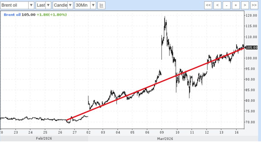 ¿Qué esperan? No está claro. Porque el estrecho por sí solo no se va a desbloquear. Y los precios del petróleo han vuelto a subir, amenazando con provocar otra crisis global. Según la tendencia claramente visible en el gráfico (si no ocurre un milagro), para finales de mes el barril de Brent costará 150$/barr. (y el ruso Urals, por consiguiente, más de 135$/barr.).