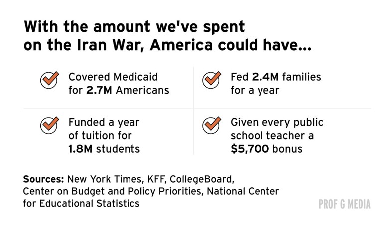 Primero, una auditoría financiera rápida. Según lo que nos ha dicho el Pentágono, se estima que hemos gastado casi $22 mil millones en la Operación Epic Fury hasta ahora. Para poner esto en perspectiva, es suficiente dinero para cubrir Medicaid para 2,7 millones de estadounidenses, o alimentar a 2,4 millones de familias durante un año, o cubrir un año de matrícula para 1,8 millones de estudiantes. Tenga en cuenta que solo han pasado 18 días. Considere cómo podría ser la factura de Irán en seis meses, o incluso en seis años.