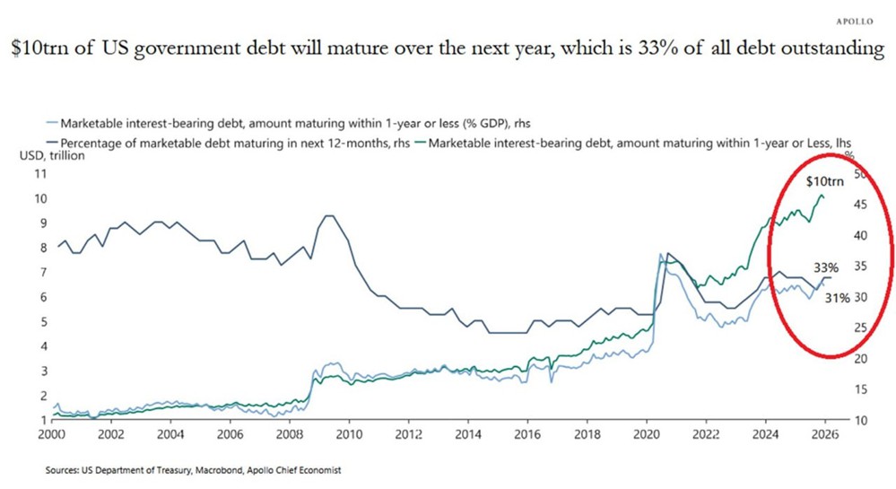 En 12 meses vencen $10B en deuda pública (33% del total negociable). Déficit: $2B. Emisión corporativa: otros $2B. Oferta total en 2026: $14B en bonos grado inversión.