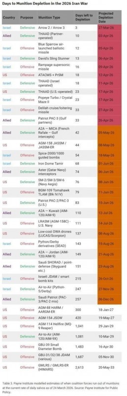 El Arrow 2/3 de Israel se agotará en las próximas 48 horas. A partir de ahí, el THAAD de Israel, que se espera que dure hasta el 11 de abril, asume toda la carga de los misiles balísticos de alta altitud. Probablemente fallará antes del 6 de abril.