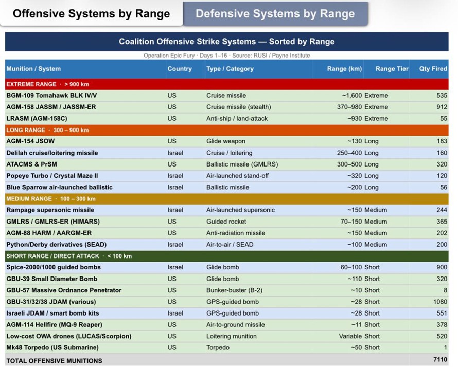 El Centro de Investigación Británico Royal United Services Institute (RUSI) publicó una evaluación de las reservas de armamento ofensivo y defensivo de EE. UU., Israel y sus aliados (países del Golfo).