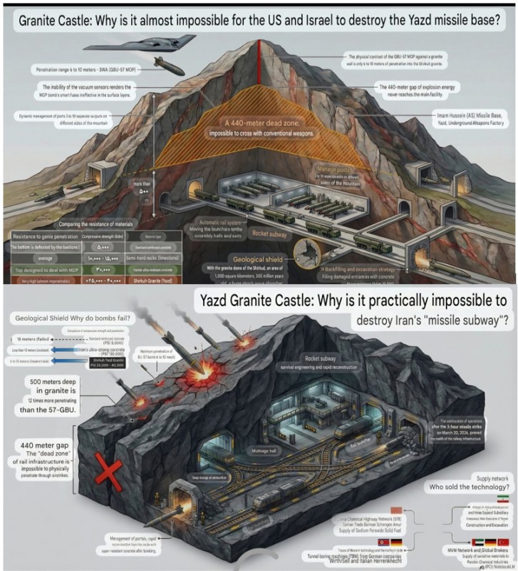 La base de misiles de Yazd, oficialmente llamada «Base Imam Hussein», no es solo un búnker. Está tallada en granito de Shirkuh, una de las rocas más duras de la corteza terrestre, con una resistencia a la compresión de 25.000 a 40.000 PSI.