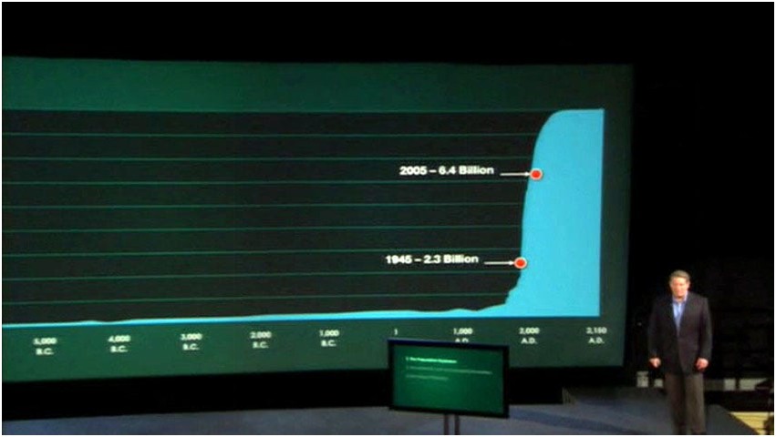 Al Gore presentando su famosa presentación de diapositivas alrededor de 2006. Aquí muestra un gráfico de la población mundial.