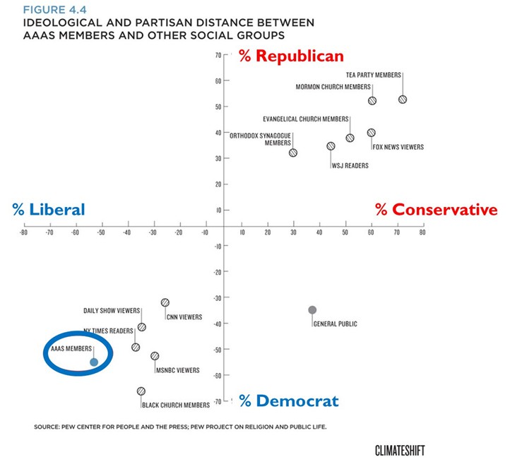 En 2009, los miembros de la AAAS eran más partidistas e ideológicos que la mayoría de los grupos, y estaban muy alejados del público en general. Fuente: Nisbet 2011 , anotado por mí.