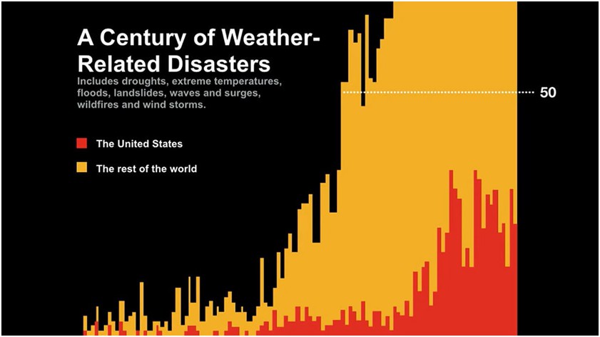 Para su conferencia en la AAAS, Gore actualizó su famosa presentación de diapositivas de la película original con algunas diapositivas nuevas. Casi al final de su charla, mostró un gráfico del Centro de Investigación sobre la Epidemiología de los Desastres (CRED) que mostraba una drástica tendencia al alza en los desastres relacionados con el clima, lo que utilizó para argumentar que el cambio climático ya estaba produciendo «desastres relacionados con el clima completamente sin precedentes».¹ Un fragmento de esa diapositiva puede verse arriba.