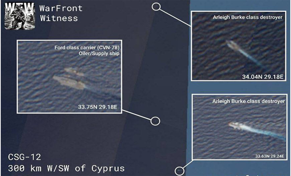 El grupo de ataque de portaaviones estadounidense centrado en torno al USS Gerald R. Ford (CVN-78) estaba operando al este de Chipre (aproximadamente 33,75°N, 29,18°E). Ya había estado presente en la misma zona dos días antes, confirmando que no está en tránsito y se espera que permanezca estacionado allí hasta que se emitan nuevas órdenes operativas.