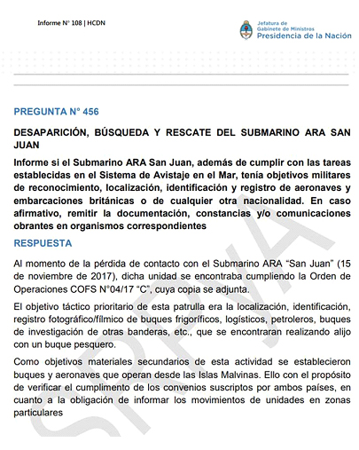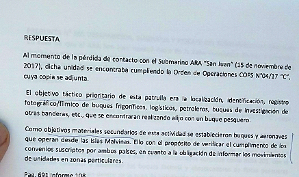 Peña respondió a la pregunta 456 del informe 108, que envió a la Cámara de Diputados esta semana, que el objetivo primario del ARA San Juan "era la localización, identificación, registro fotográfico/fílmico de buques frigoríficos, logísticos, petroleros, buques de investigación de otras banderas, etc., que se encontraran realizando alijo con un buque pesquero". Luego agregó: "Como objetivos materiales secundarios de esta actividad se establecieron buques y aeronaves que operan desde las Islas Malvinas. Ello con el propósito de verificar el cumplimento de los convenios suscriptos por ambos países, en cuanto a la obligación de informar los movimientos de unidades en zonas particulares".