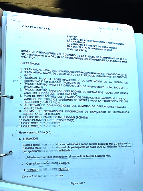 "Este documento no lo vimos los familiares. Nos contaron por escrito cuál era la OP. La exposición que nos hicieron coincidía con lo que me dijo mi hijo, pero no con estos datos corregidos. El área de patrulla real y correcta es la impresa y tachada. La otra manuscrita es imposible porque quedan las islas en el medio", dijo el familiar de uno de los 44 tripulantes del ARA San Juan.