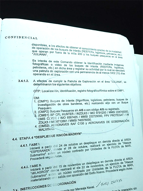 De acuerdo con el Cronista Comercial, el mencionado texto sostenía que "es de interés de este comando obtener la identificación mediante imágenes fotográficas o video de los buques de interés en dicha área (denominada 'Juliana') y registrar su actividad".