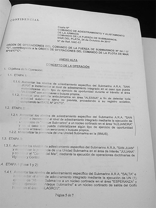 En la página 8 de la Orden de Operaciones del ARA San Juan se tacharon las coordenadas y las manuscritas sitúan en las islas Malvinas al submarino