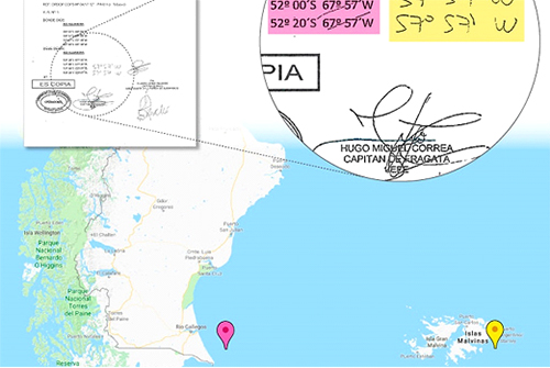 Si se busca en un mapa una de las dos coordenadas manuscritas, 52° 00' S 57° 57' W, el lugar indicado para que opere el submarino es la costa de la isla Soledad, en Malvinas, cerca de Puerto Argentino. Cuando se ingresa la otra: 52° 20' S 57° 57' W, la ubicación del ARA San Juan es tan solo unos 30 kilómetros más arriba, siempre en las cercanías de las Islas Malvinas. En tanto, las coordenadas impresas en el documento 52° 00' S 67° 57' W y 52° 20' S 67° 57' W, ubicaban al ARA San Juan cerca de Comodoro Rivadavia.