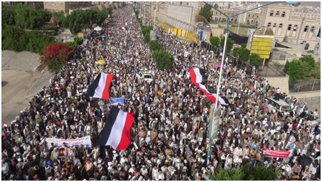 Grandes multitudes de ciudadanos yemeníes de todo el país acudieron a la plaza de Al-Sabin en Saná con el objetivo de mostrar su pleno apoyo a las fuerzas armadas y comités populares combatientes contra la monarquía de Al Saud (la familia reinante de Arabia Saudí), además de condenar la guerra lanzada por su vecino norteño contra el más pobre entre los países árabes.