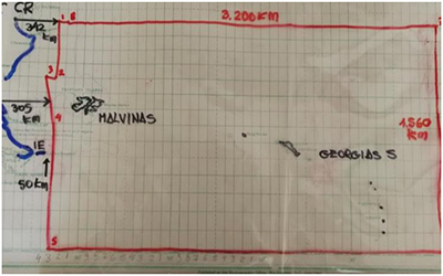 Fig 1: Gráfico que muestra con una línea de color rojo la zona delimitada en el Anexo 1 de los Acuerdos de Madrid que obligan a informar los movimientos de unidades de combate de las FFAA.