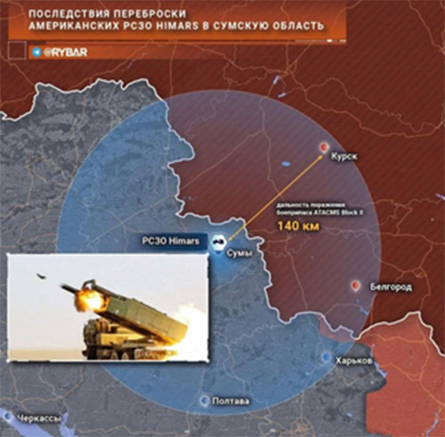 Mientras tanto, los "expertos" de la red han "descubierto" durante mucho tiempo que el HIMARS está armado con municiones ATACMS Block II con un alcance de lanzamiento de 140 kilómetros. Y algunos apuntan audazmente al misil táctico operativo ATACMS Block IA con un alcance de 300 km. Para mayor persuasión, se dibujan mapas apropiados. Como éste:
