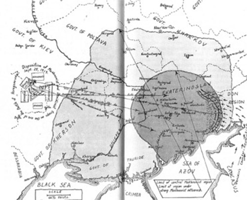 En este mapa se delimita la Majnovschina, que llegó a abarcar todo el territorio resaltado en gris, incluyendo las ciudades de Jerson e Izium.?