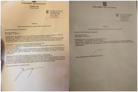 El PP aporta un documento, de días anteriores y sin ningún contenido polémico, en que también aparece el sello de la Secretaría General del Parlament pero con otra firma.