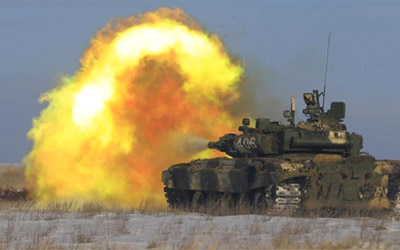 El tanque T-90 goza de un nuevo paquete de armadura laminada, armadura reactiva explosiva y una suite de contramedidas electrónicas, y tiene una precisión increíble a la hora de disparar largas distancias.
