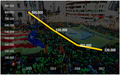 Asimismo, esta asociación contraria a la independencia demuestra cómo las movilizaciones organizadas por la Assemblea Nacional Catalana (ANC) y Òmnium Cultural han ido perdiendo fuelle, así como espectacularidad, desde 2013. En este sentido, el número de asistentes a la concentración independentista del 11 de septiembre se ha reducido a una cuarta parte, al pasar de las 800.000 personas registradas en 2013 a las 220.000 de este año.