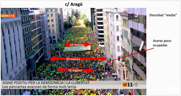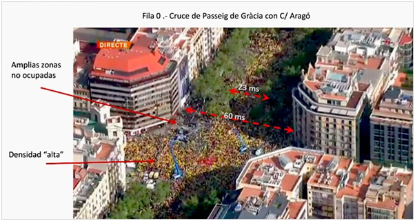 En el informe se explica que, el pasado lunes, tanto las aceras, como la plaza de Catalunya, registraron una densidad media o baja, pues en algunos puntos se evidenciaron muchos huecos y la circulación libre no estaba dificultaba. Concluyen que, con un error estimado de +/- 21.578 personas, la Diada concentró a 220.418 personas repartidas en el cruce de Passeig de Gràcia/ Aragó (9.677), lado montaña (66.139), Besós (27.272), lado mar exceptuando plaza Catalunya (55.670), lado mar de plaza Catalunya (24.558) y el lado Llobregat (37.100).