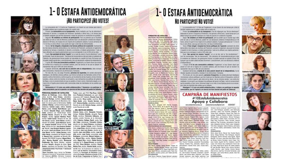 Casi un millar de personas de la izquierda que se definen contrarias a las políticas de Mariano Rajoy han firmado un manifiesto contra la celebración del referéndum de independencia de Catalunya suspendido por el Tribunal Constitucional. “Rechazamos el 1 de octubre como una trampa antidemocrática. Y llamamos a no participar en esta convocatoria, que es lo opuesto a un ejercicio de libre decisión del pueblo de Catalunya”, reza el manifiesto “1-O Estafa Antidemocrática. No participes. No votes”, que aparece este domingo en las páginas de política de el diario El País en catalán y en castellano. Aparece como publicidad y ha sido financiado por los firmantes, revela el diario en una nota al pie de página.