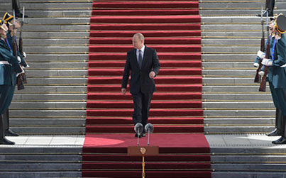Tras su breve trayecto motorizado, el político ruso se ha dirigido a la sala de San Andrés del Gran Palacio del Kremlin, donde ha jurado su cargo. Durante esa caminata, una banda militar ha interpretado la canción 'Nuestro presidente', compuesta especialmente para la ocasión.