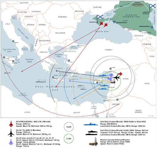 1. La fuerza naval rusa opera bajo una «sombrilla» AD significativa y altamente integrada con S-400 y S-300 basados ??en tierra en Siria y sistema de alerta, que incluye activos de espacio aéreo, tales como capacidades de reconocimiento satelital y los AWACS A-50.
