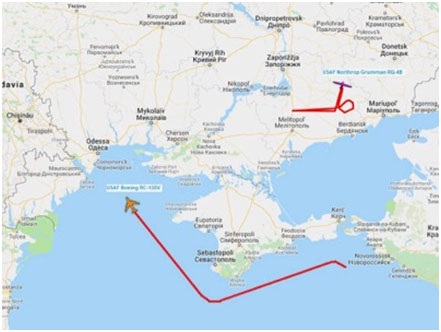 ?- El 5 de noviembre, un avión ruso Su-27 interceptó un avión estadounidense de reconocimiento ?electrónico EP-3 que volaba cerca de las aguas territoriales de Crimea. El 19 de noviembre, un ?avión israelí de reconocimiento Gulfstream G-550 NachshonAitam (indicativo del vuelo 537) ?sobrevoló el Mar Negro alrededor del Estrecho de Kerch. El incidente registrado en el Estrecho ?de Kerch fue seguido durante todo el día por aviones estadounidenses de reconocimiento ?especializados en la “Inteligencia de Señales” (SIGNIT). Uno de esos aviones, del tipo RC-135V, ?serie 64-14841, indicativo JONAS 21, con base en la bahía griega de Suda (isla de Creta), ?se movió sobre el litoral del Mar Negro, cerca de Crimea. Una segunda aeronave –un drone de ?vuelo a gran altitud del tipo RQ-4B, serie 11-2047, con el indicativo FORTE10– voló por el este de ?Ucrania, cerca del Mar de Azov. El RQ-4B es operado desde la base estadounidense de Sigonella, ?en la isla de Sicilia (Italia).?