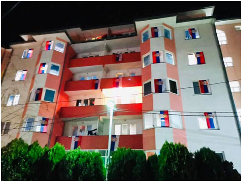 En respuesta, los serbios en el norte colgaron docenas de banderas serbias en las ventanas de sus apartamentos. Las fotos en las redes sociales y en los medios de comunicación serbios muestran edificios cubiertos con pancartas, con numerosos ventanales, balcones y frentes de tiendas que muestran banderas.