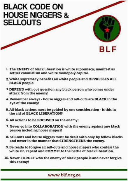 "Nosotros somos pobres porque ellos son ricos" agregó el joven político, mientras se dirigía al público. El responsable del BLF prometió que "por cada persona negra asesinada, mataremos a cinco personas blancas". La multitud aplaudía.