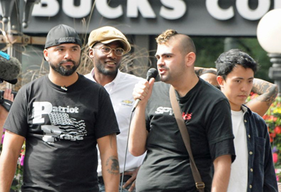A la izquierda Joey Gibson. Pueden verle acompañado por miembros afroamericanos.
