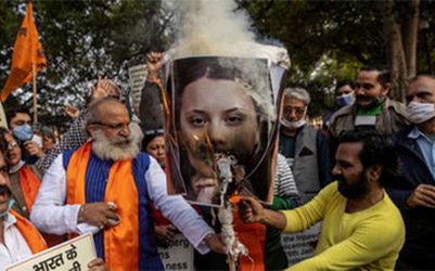 Este jueves, la portavoz del Partido Popular Indio (Bharatiya Janata, o BJP), Meenakshi Lekhi, declaró que con su apoyo a los agricultores, Thunberg suscribe la "conspiración" de las fuerzas extranjeras para difamar a India. En esta misma jornada, activistas del Frente Unido Hindú protestaron contra los comentarios de celebridades extranjeras sobre los asuntos internos de su país, y en Nueva Delhi quemaron imágenes de la activista climática sueca y de la cantante de Barbados.