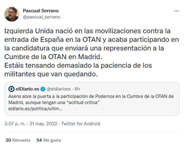 "Izquierda Unida - escribía Serrano en su cuenta de Twitter - nación en las movilizaciones contra la entrada de España en la OTAN y acaba participando en la candidatura que enviará una representación a la Cumbre de la OTAN de Madrid. Estáis tensando demasiado la paciencia de los militantes que van quedando".