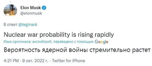 • Elon Musk, Donald Trump, el Papa y Erdogan hablaron sobre el tema de la amenaza de guerra nuclear y la necesidad de negociaciones urgentes entre Estados Unidos y la Federación Rusa en los últimos días. A medida que las partes se acercan gradualmente a las fronteras del territorio del remake de la crisis del Caribe, la retórica asociada con la necesidad de acuerdos frente a la aniquilación nuclear se está filtrando gradualmente en la corriente política principal.