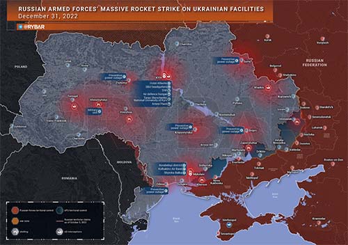 - El 31 de diciembre de 2022, las Fuerzas Armadas de la Federación Rusa lanzaron un ataque con armas lanzadas desde el aire de largo alcance y alta precisión en las instalaciones del complejo militar-industrial de Ucrania involucrado en la fabricación de vehículos aéreos no tripulados de ataque utilizados para llevar a cabo ataques terroristas contra la Federación Rusa. También se vieron afectados los estacionamientos de almacenamiento y los sitios de lanzamiento de UAV de ataque.
