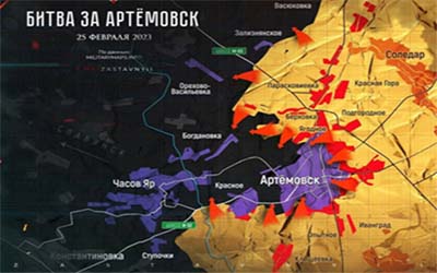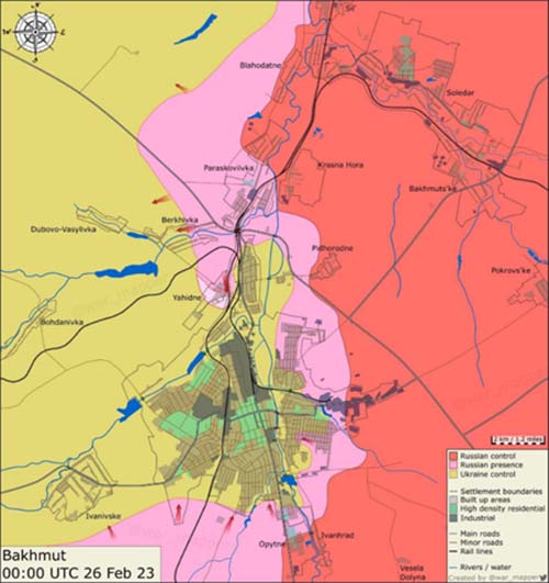 Aquí hay un par de mapas de imágenes grandes que muestran la posición actual de las fuerzas rusas y ucranianas en Bakhmut y sus alrededores. Como puede ver, los rusos (es decir, el Grupo Wagner) están haciendo avances rápidos después de meses de progreso lento y parecen estar al borde de un cerco táctico de las unidades ucranianas.