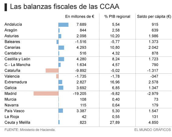 De la Fuente ahonda en la catástrofe que supondría abrir esta caja de Pandora. «La actual situación genera unas diferencias enormes de financiación a favor de las comunidades forales, hasta el punto de que estas reciben una subvención neta del resto del país a pesar de su elevado nivel de renta. Extender el sistema a otros territorios en estos términos sería muy mala idea. Concedérselo a Cataluña sería muy gravoso para el sistema, pero es que, además, al día siguiente lo reclamarían Madrid, Baleares y Aragón y habría muy pocos argumentos para negárselo».
